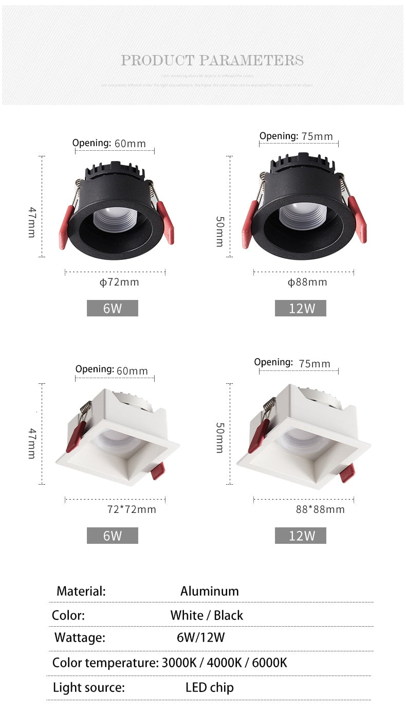 BRGT LED Downlight Recessed Anti Glare Spot Lights Aluminum White 6W 12W Ceiling Lamp 110V 220V For Kitchen Home Indoor Lighting - Square Black 6W / 6000K white light is backordered and will ship as soon as it is back in stock.