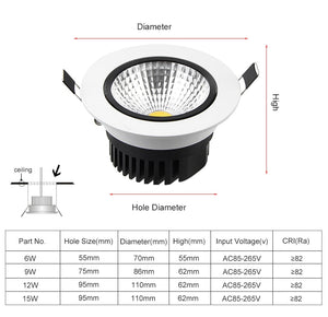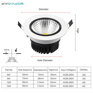 DVOLADOR Dimmable Recessed Downlight CoB Chip 6W 9W 12W 15W Ceiling Spot light White Warm White Emitting Color Rendering Lamp