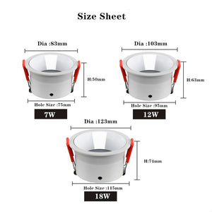 Category: 110V, 12W, 18W, 220V, 7W, 90-260V, Anti-glare, Dimmable, Downlights, LED, Natural White, Recessed, Round, Warm White, White