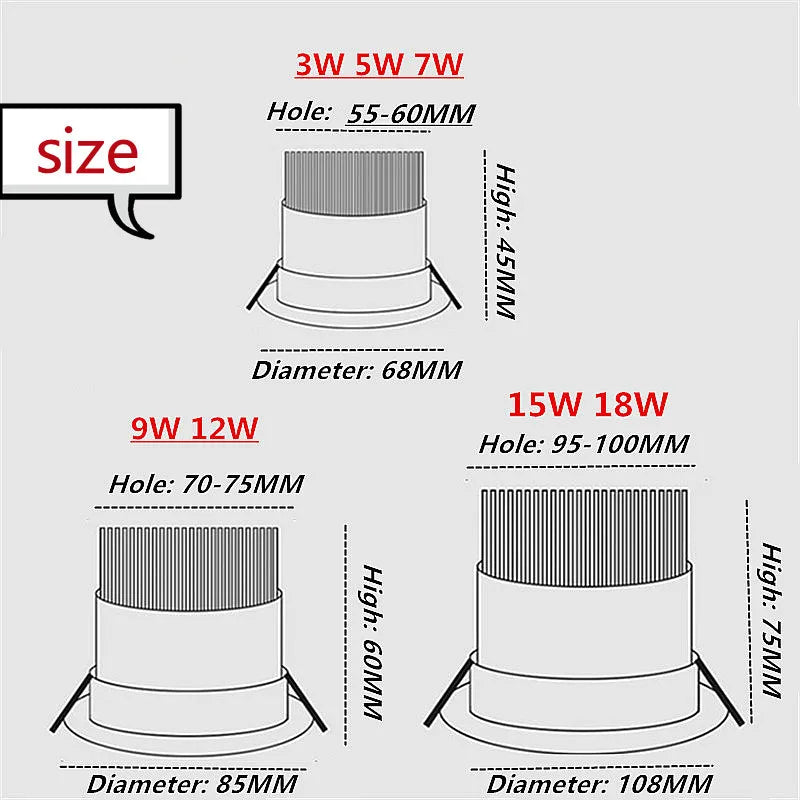 Dimmable Living room bedroom dining room spot light Led Downlight Light Ceiling Spot 3w 5w 7w 9w 12w 15w 18w AC85-230V Recessed