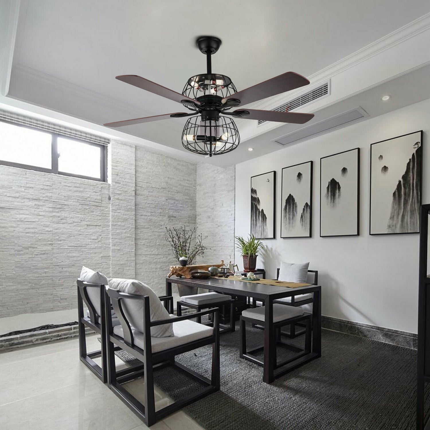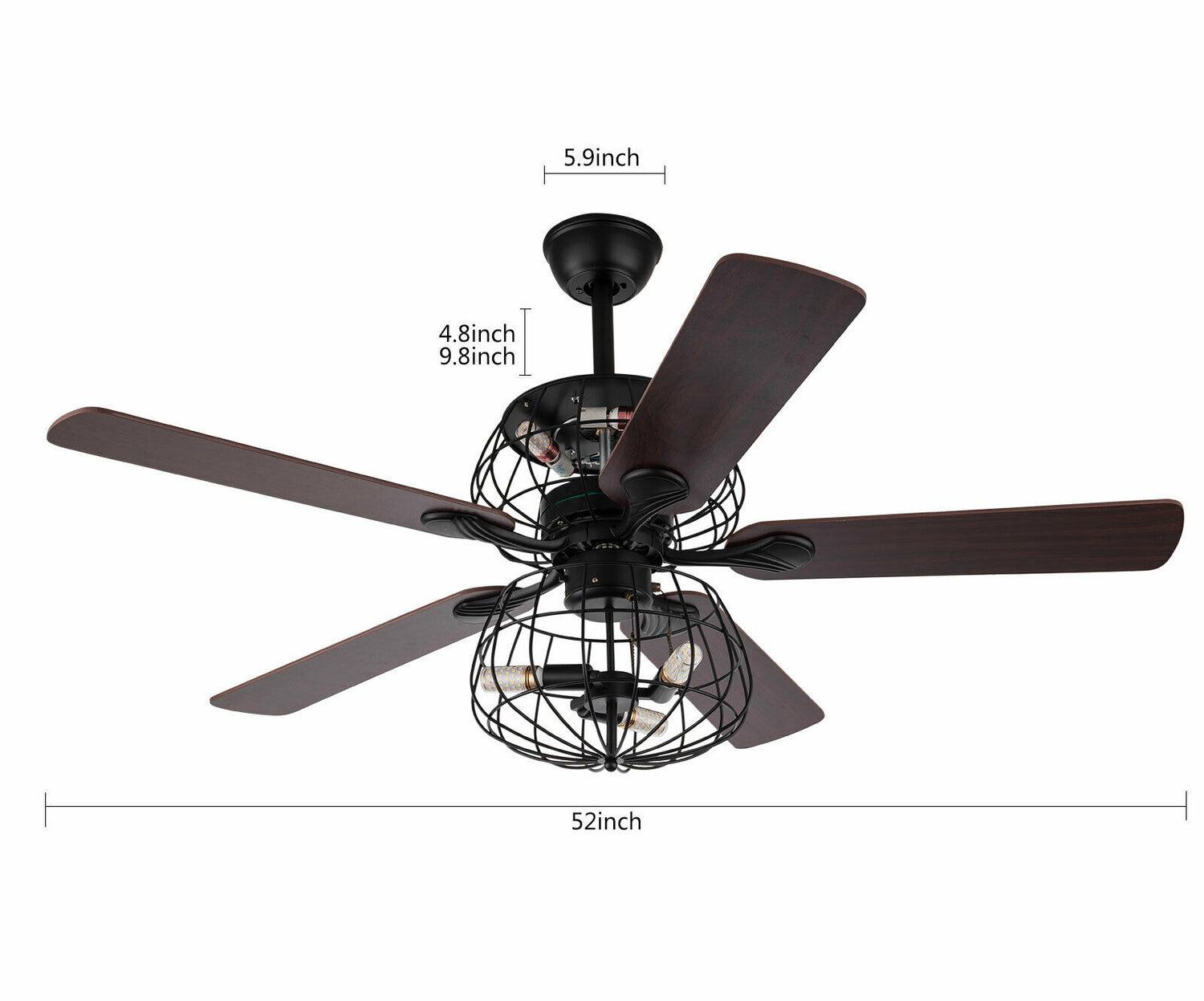 LED Ceiling Fan Light 3 Speed Setting 5 Reversible Wood Blades Retro Cage Chandelier with Remote Control