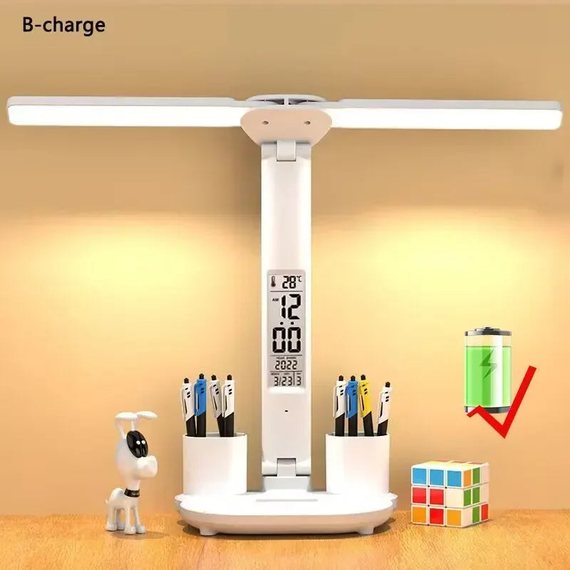 LED Clock Table Lamp USB Chargeable Dimmable Desk Lamps 2 Heads 180 Rotate Foldable Eye Protection Desktop Reading Night Lights